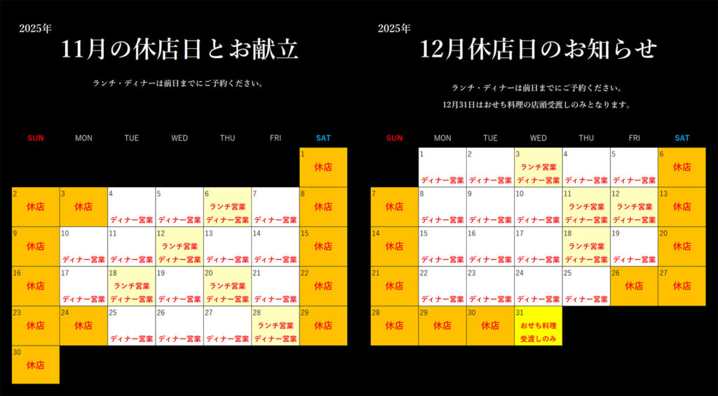 <12月> 6、7、13、14、20、21、26~30日 *12月31日は事前お申込みのおせち受渡しのみとなります。