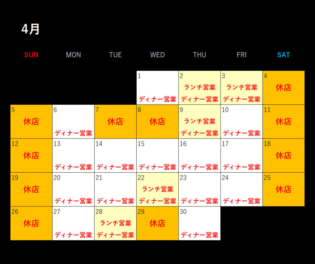 2026年4~6月の休業日を下記の通りお知らせいたします。